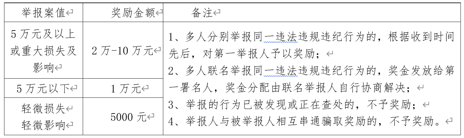 三、舉報內容一經查實,公司給予舉報人獎勵,具體標準如下表所示: