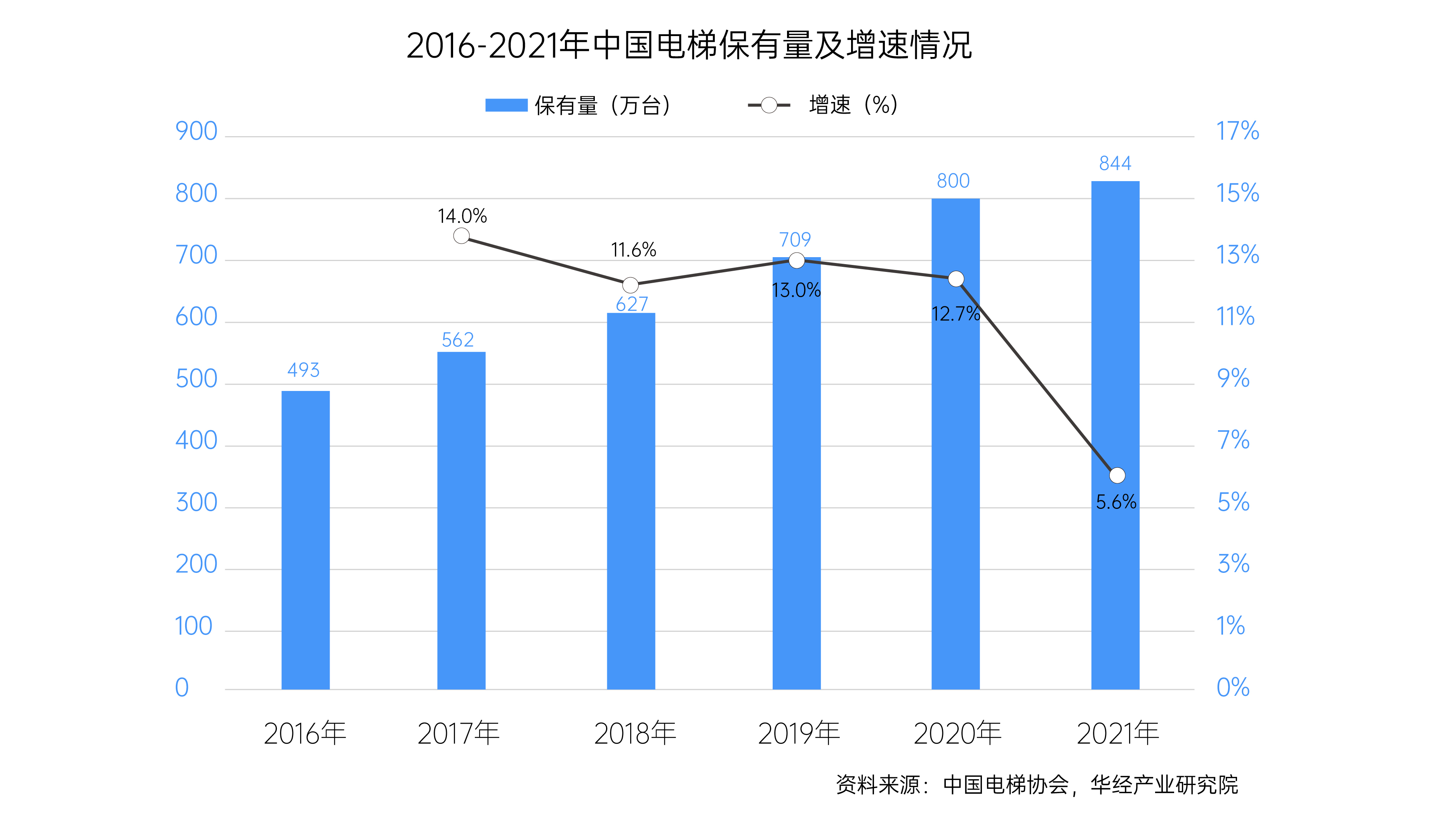 資料顯示,2021年我國(guó)電梯保有量為844萬(wàn)臺(tái),同比增長(zhǎng)5.6%。在人口基數(shù)較大,人均電梯使用保有率提升,以及人口老齡化加重,老舊小區(qū)持續(xù)推進(jìn)電梯新裝等背景下,我國(guó)電梯行業(yè)也迎來(lái)了增長(zhǎng)的重要契機(jī)。